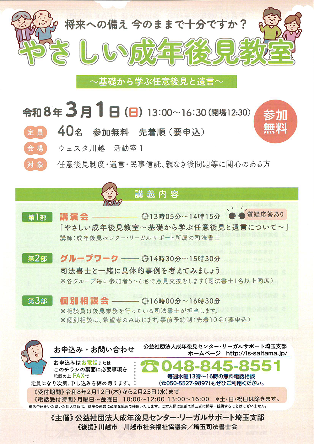 親族のための後見人講座「やさしい成年後見教室」開催のお知らせ